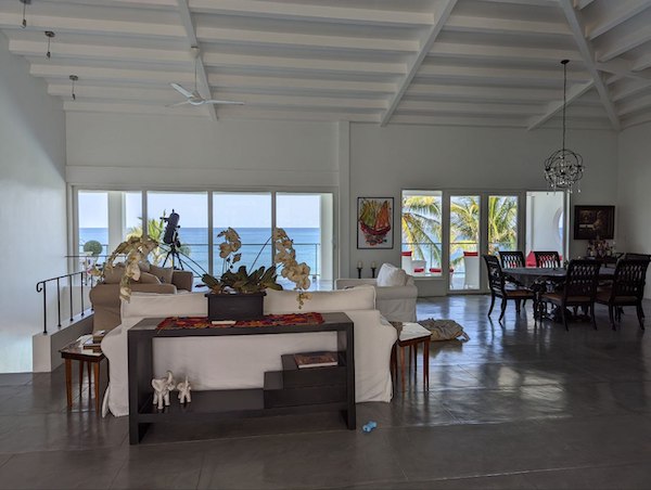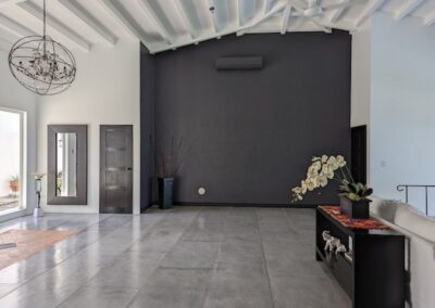 The house welcomes you with open spaces and high ceilings. This upper-level living and dining area with state-of-the-art amenities leads to a balcony that overlooks the pool and ocean.