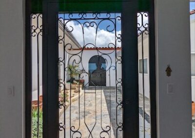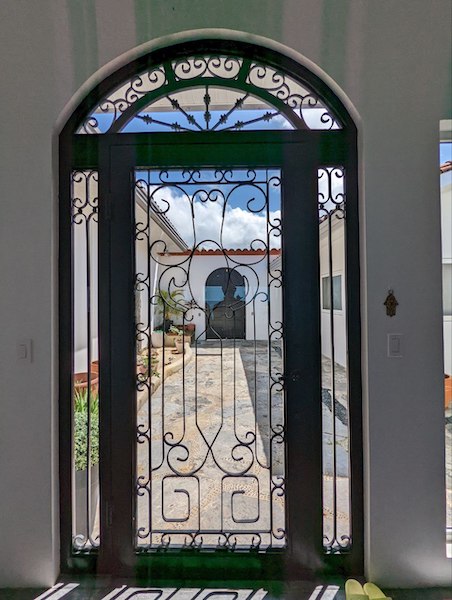 The wrought-iron, gated entrance boasts an attractive cobblestone entryway with a garden.