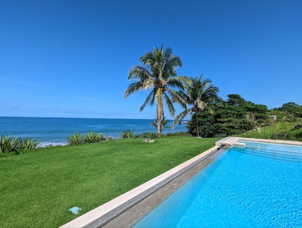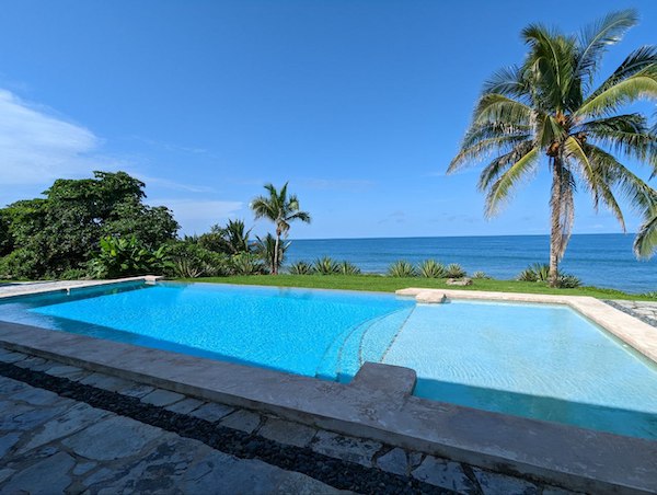 This tropical landscape surrounds a large infinity pool and includes palm trees and direct access to the sandy beaches of the Pacific Ocean.