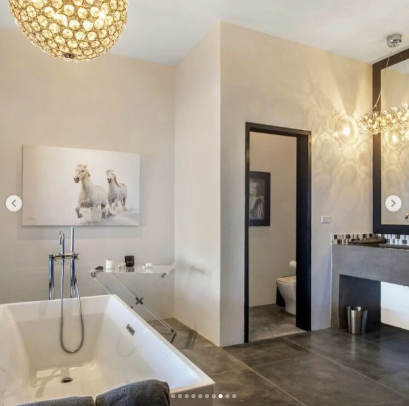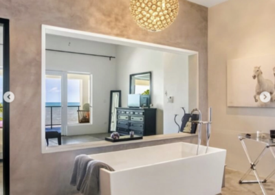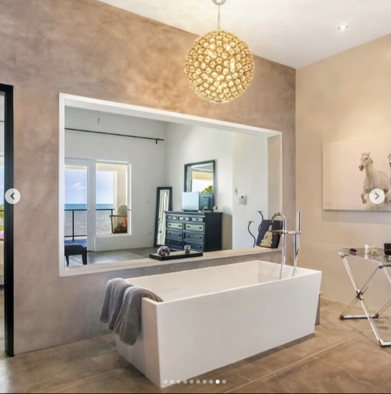 The master suite includes a stand-alone soaking bathtub and ocean views.